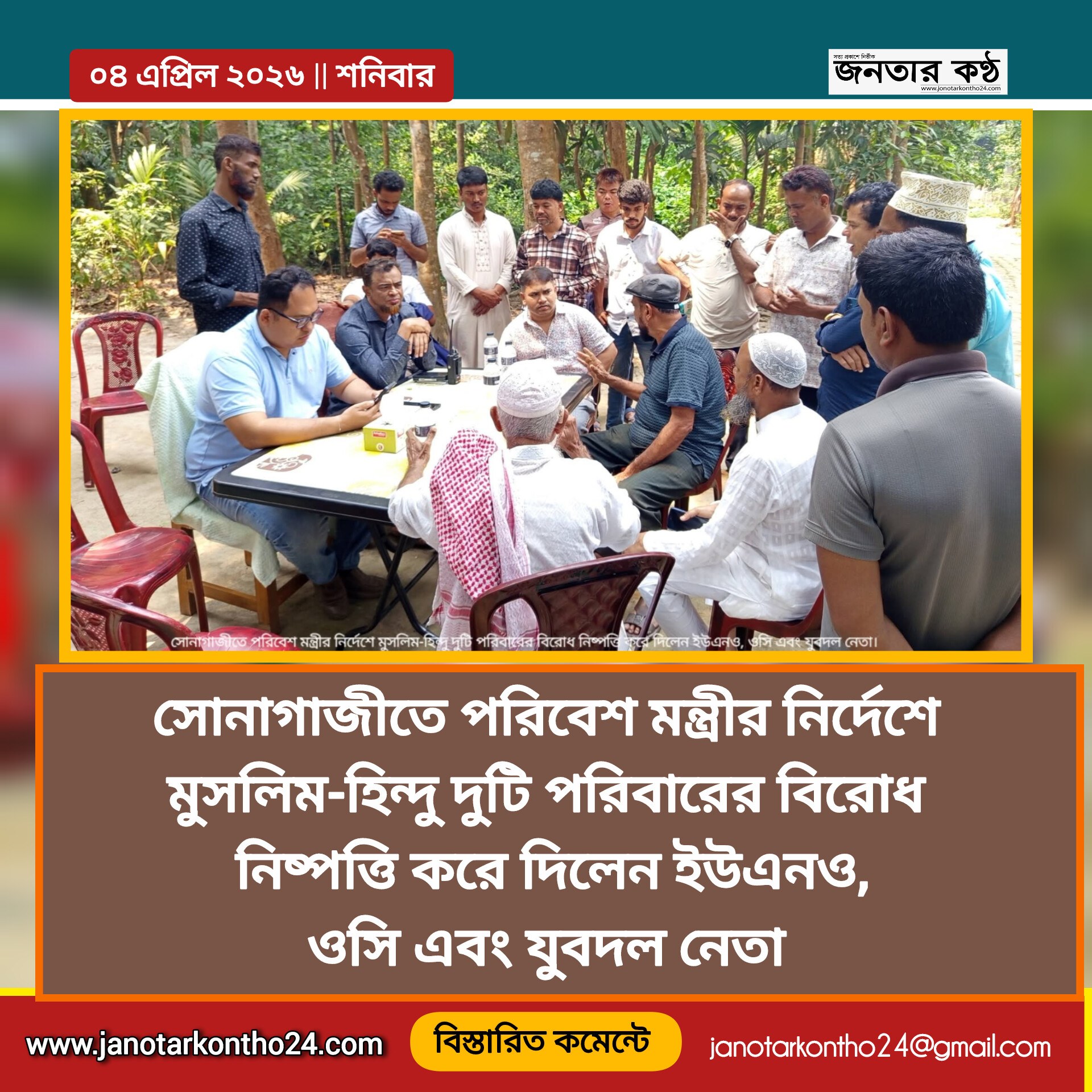 ফেনীর সোনাগা জীতে পরিবেশ মন্ত্রীর নির্দেশে মুসলিম-হিন্দু দুটি পরিবারের জমি নিয়ে সীমাা বিরোধ নিষ্পত্তি করে দিলেন ইউএনও, ওসি এবং যুবদল নেতা।