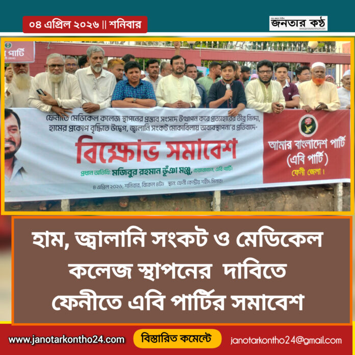 ফেনীতে মেডিকেল কলেজ স্থাপনের প্রস্তাব সংসদে উত্থাপন করে প্রত্যাহারের তীব্র নিন্দা, হামের প্রকোপ বৃদ্ধিতে উদ্বেগ, জ্বালানি সংকট মোকাবিলায় অব্যবস্থাপনার প্রতিবাদে ফেনীতে বিক্ষোভ সমাবেশ করেছে আমার বাংলাদেশ পার্টি (এবি পার্টি)।